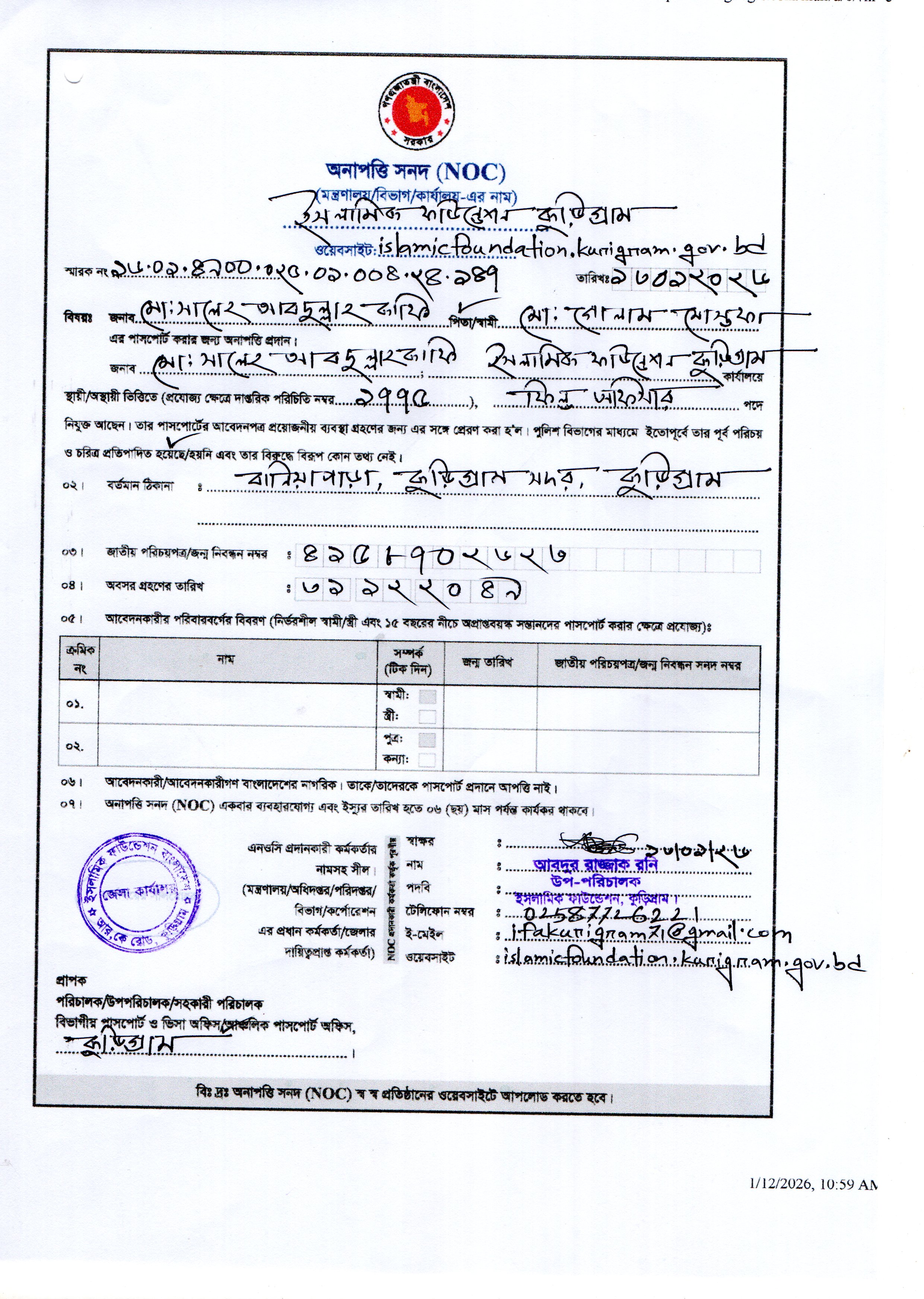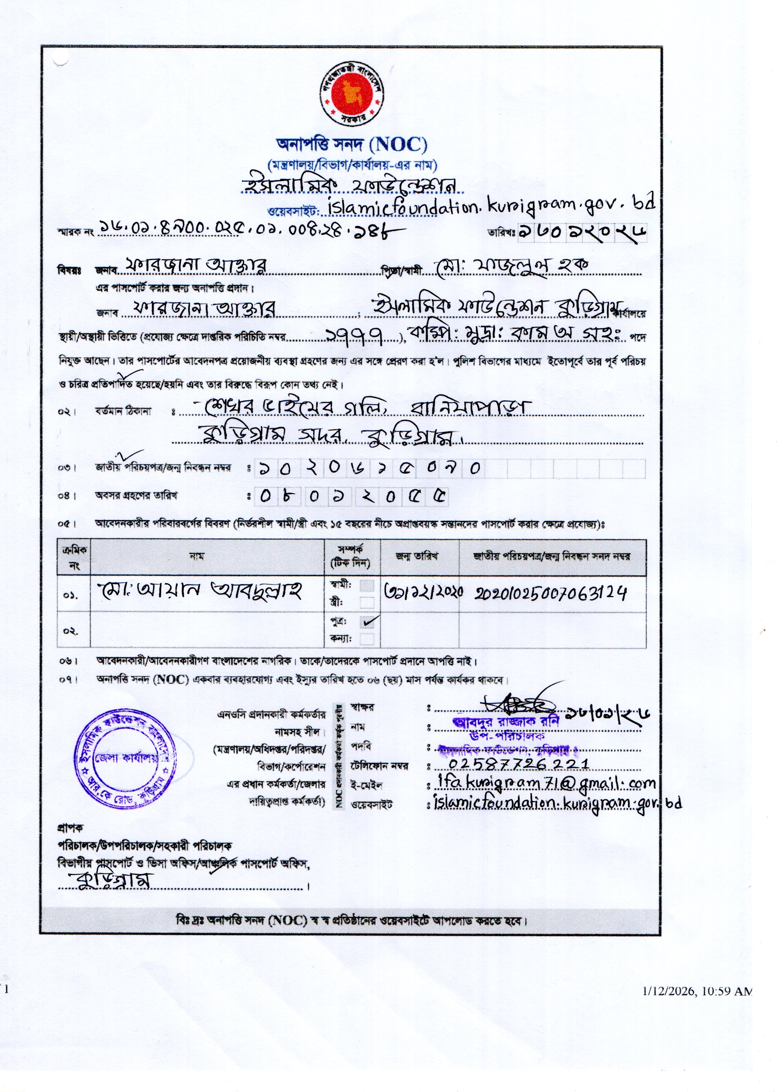 | ২ | ইসলামিক ফাউন্ডেশন কুড়িগ্রাম এর ফিল্ড অফিসার জনাব মোঃ সালেহ আবদুল্লাহ কাফি এর পাসপোর্ট এর বিভাগীয় অনাপত্তিপত্র | | ১৪-০১-২০২৬ | দেখুন |